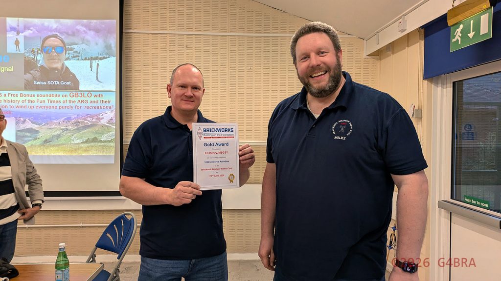 Ed G8GSY was the first to be awarded a Gold Brickworks Award from the Club Brickworks Champion Daniel G4DGC.